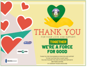 The management would like to thank you for your participation and donation during our “Auction for a Cause” event. We reach our goal amount of $2,000.00; this will go along way to our brothers and sisters in the community. Below is the Covenant House Vancouver acknowledgement of our donation. We hope to see you again in our future community activities.